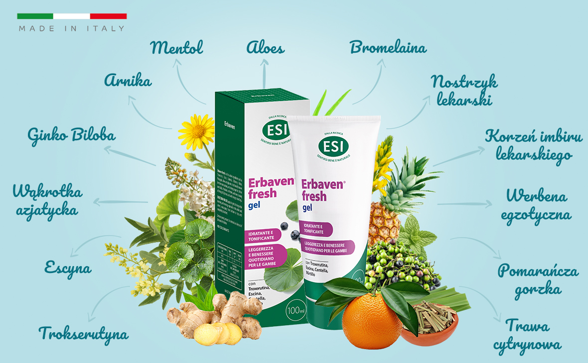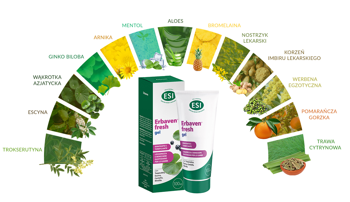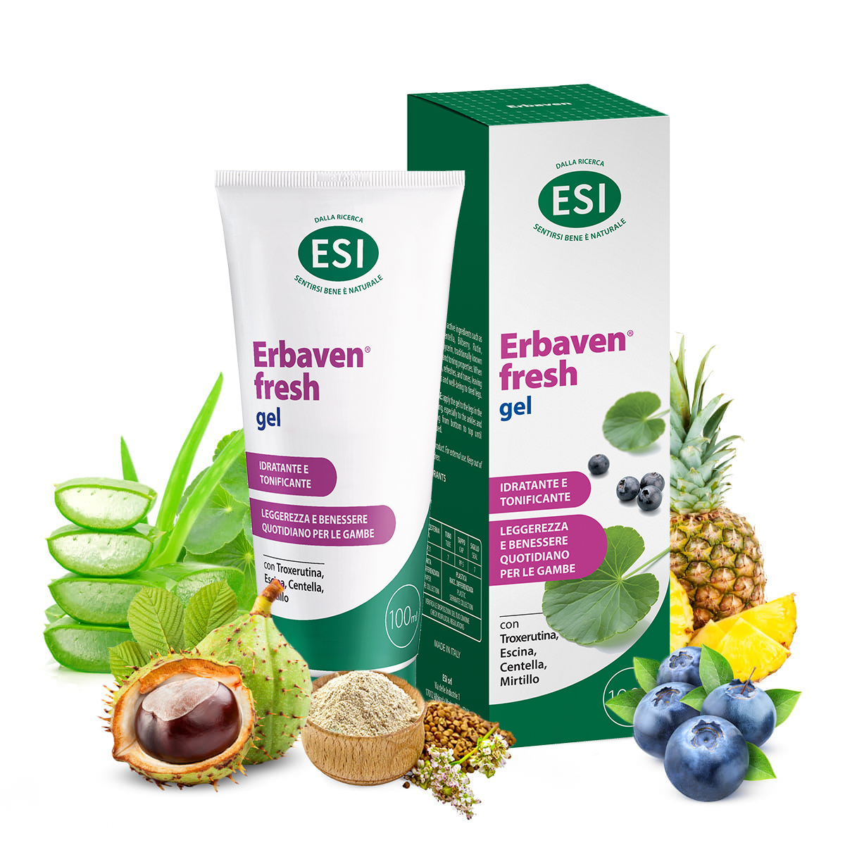 Erbaven żel jest bogaty w składniki aktywne, takie jak: trokserutyna, escyna, centella, borówka amerykańska, rutyna, ananas, aloes i gliceryna, tradycyjnie znane ze swoich właściwości nawilżających i tonizujących. Stosowany codziennie nawilża, odświeża i tonizuje, pozostawiając uczucie lekkości i dobrego samopoczucia zmęczonym nogom.