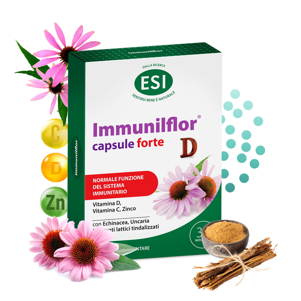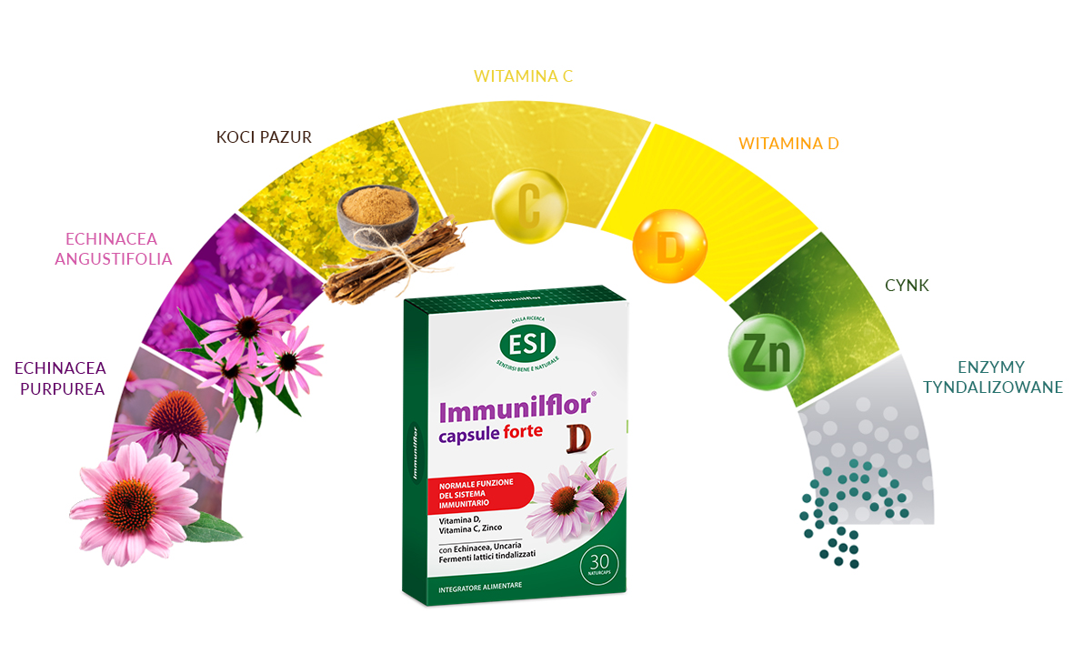 Jeżówka purpurowa (Echinacea purpurea (L.) Moench) – suchy ekstrakt standaryzowany na zawartość polifenoli ogółem 4%; kwas L-askorbinowy (witamina C); substancja glazurująca: hydroksypropylometyloceluloza; Koci pazur (Uncaria tomentosa (Willd. ex Schult.) DC.) – suchy ekstrakt standaryzowany na zawartość alkaloidów; Jeżówka purpurowa (Echinacea purpurea (L.) Moench) – suchy ekstrakt standaryzowany na zawartość kwasu cykoriowego 2%; cholekalcyferol (witamina D3); substancja wypełniająca: celuloza; Jeżówka wąskolistna (Echinacea angustifolia DC.) – suchy ekstrakt standaryzowany na zawartość echinakozydu 4%; Mieszanina kultur tyndalizowanych: Lactobacillus paracasei (HA-108), Lactobacillus helveticus (HA-122), Lactiplantibacillus plantarum (HA-119), Streptococcus salivarius subsp. thermophilus (HA-110); tlenek cynku; substancje przeciwzbrylające: dwutlenek krzemu i sole magnezowe kwasów tłuszczowych. Kultury tyndalizowane zawierają SOJĘ i POCHODNE MLEKA.