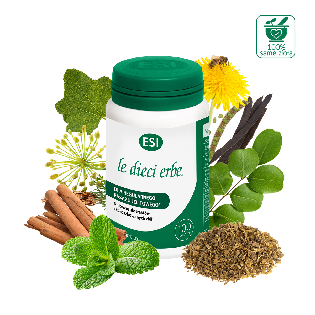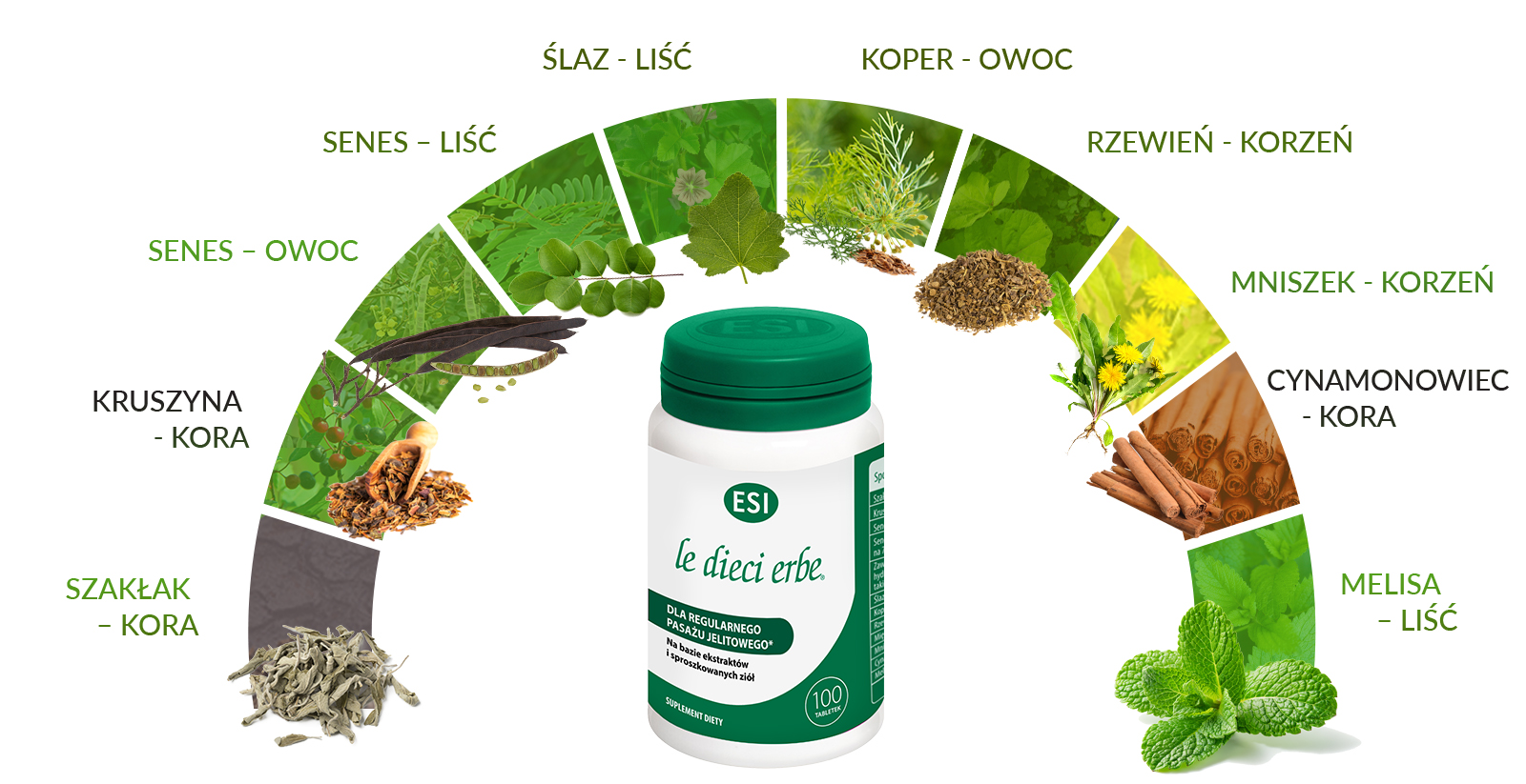 Suplement diety na bazie ekstraktów i sproszkowanych ziół. Szakłak, kruszyna, senes, ślaz, rabarbar, mniszek lekarski i cynamon wspomagają regularny pasaż jelitowy. Ślaz wspomaga prawidłową objętość i konsystencję stolca. Szakłak, kruszyna, koper włoski, rabarbar, mięta, mniszek lekarski, cynamon i melisa lekarska wspomagają funkcje trawienne. Mniszek lekarski wspomaga również funkcje oczyszczające organizmu. Melisa lekarska, koper włoski i mięta wspomagają prawidłową motorykę przewodu pokarmowego i, wraz z cynamonem, wspomagają eliminację gazów jelitowych.