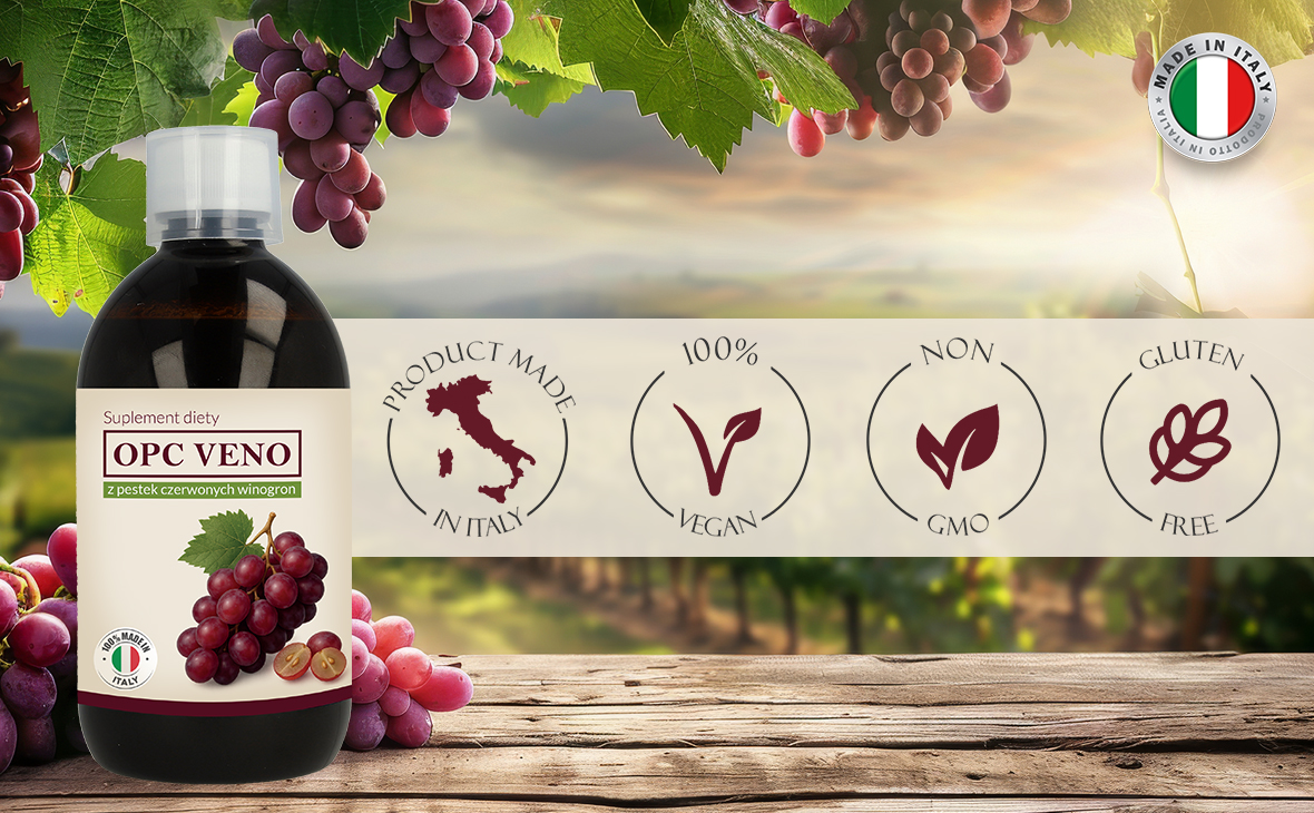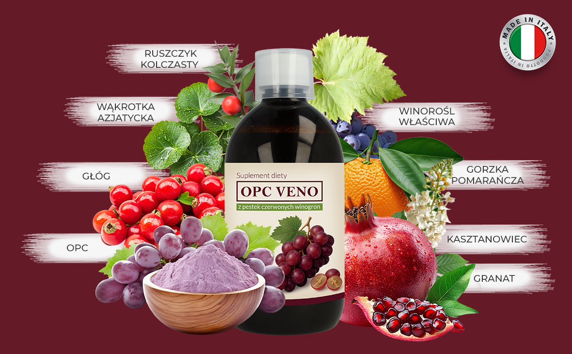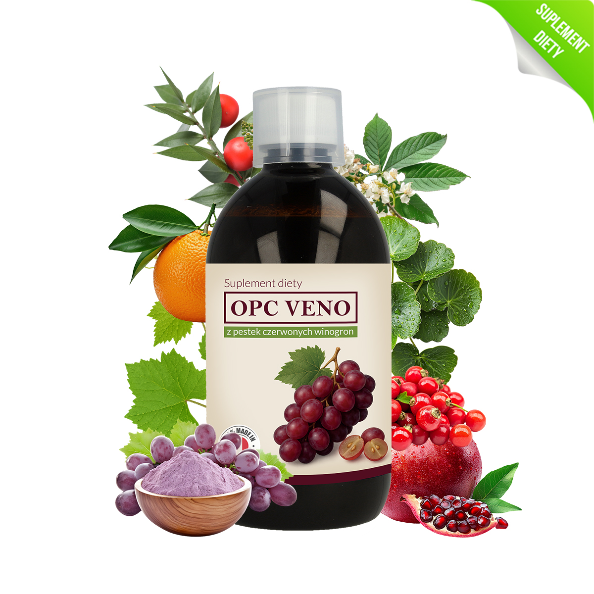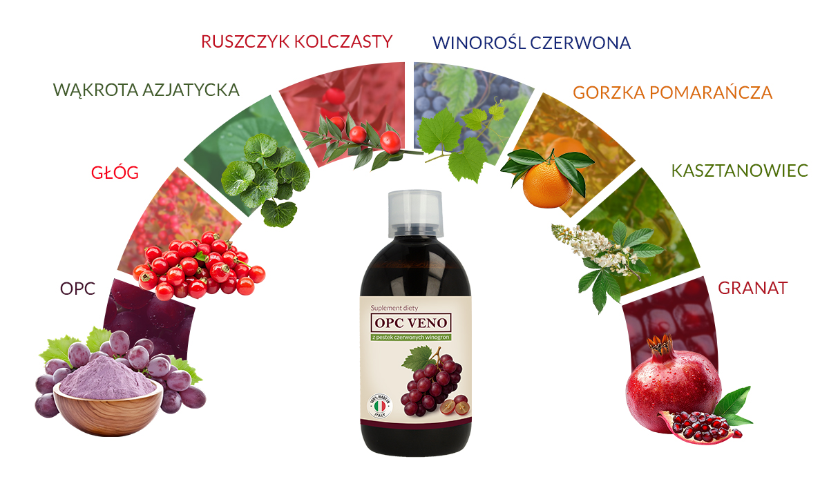 Płynny suplement diety na bazie ekstraktów roślinnych z wąkroty azjatyckiej, ruszczyka kolczastego i kasztanowca zwyczajnego z dodatkiem soku z granatu i OPC (oligomerycznych proantocyjanidyn) z czerwonych liści winorośli.